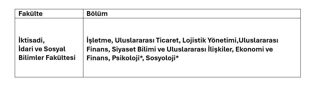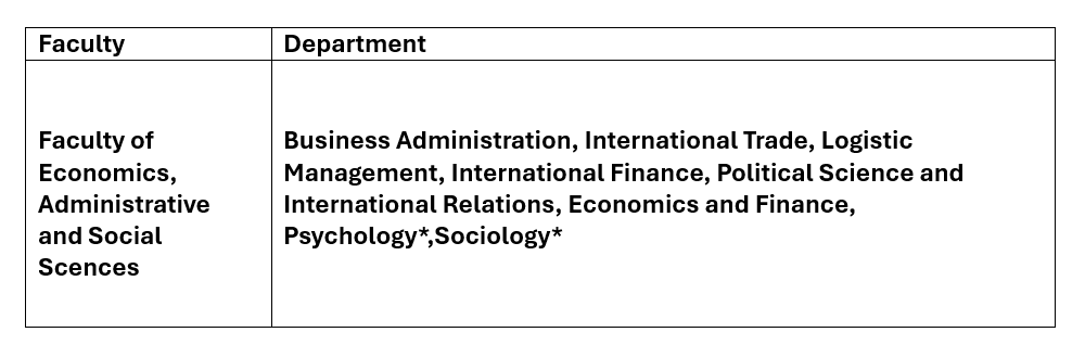 *Sosyoloji ve Psikoloji bölümü öğrencileri karşı kurumdan aldıkları 30 AKTS ders yükünün tamamının tanınacağına dair akademik onay alma şartıyla başvurmalıdır.